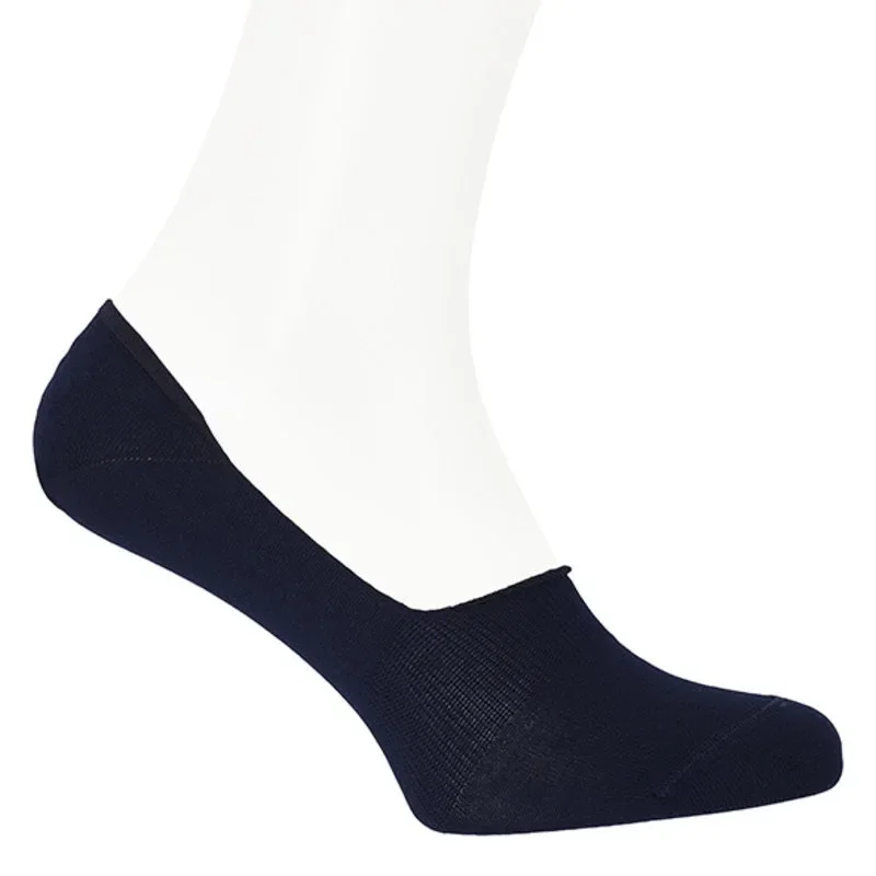 Deze donkerblauwe 'no show' sokken van Carlo Lanza zijn met zeer veel zorg gemaakt in Italie. Zoals de naam al zegt zijn de sokken onzichtbaar bij het dragen van schoenen. Essentieel in de zomer wanneer je sneakers of loafers draagt. Om te voorkomen dat de sokken schuiven in de schoenen zit er een anti-slip laag van silicone in de hiel. In de nieuwste variant zijn nu ook 2 strips silicone aan de zijkanten toegevoegd, zodat de sok bijna niet meer uit te krijgen is.