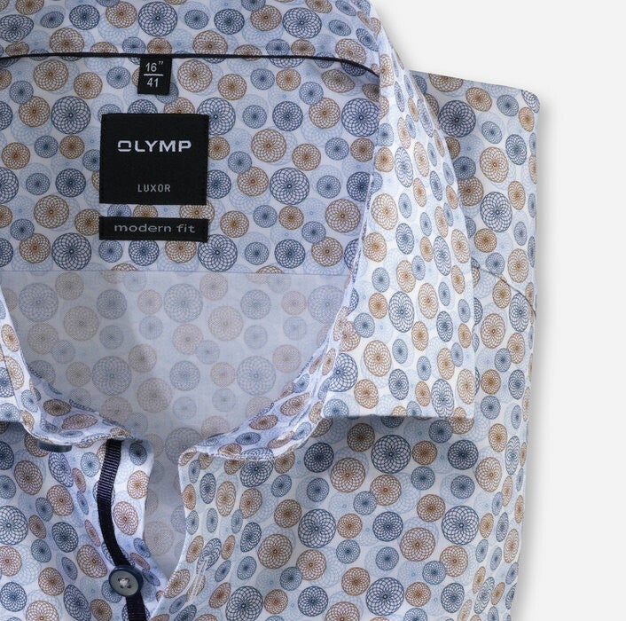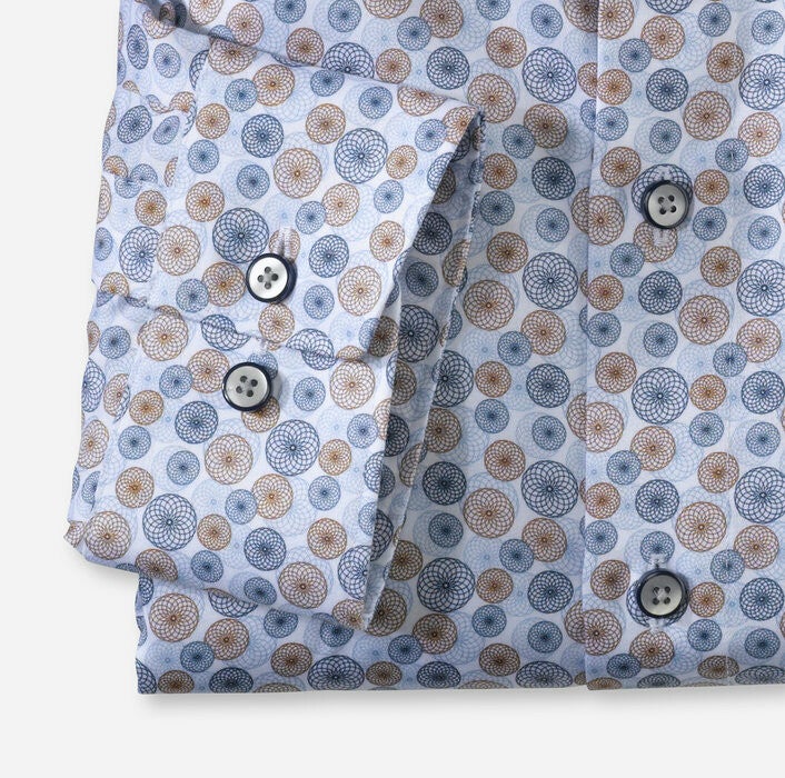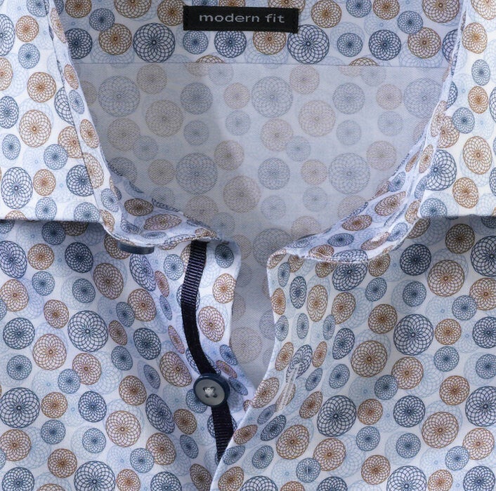 Het exclusieve zakelijke overhemd uit de lijn OLYMP Luxor modern fit in een bescheiden veranderende structuur kan grenzeloos worden gebruikt. Bescheiden en elegant tegelijk, past het bij elke stijlvolle business-look. Ademende, huidvriendelijke katoenvezels zorgen voor een aangenaam draagcomfort en pure tijdwinst dankzij de kreuk- en strijkvrije eigenschappen. Een kosmopolitische Global-Kent-kraag met een contrasterende print-omzoming en de licht getailleerde pasvorm zorgen voor een zelfbewust en modieus statement.