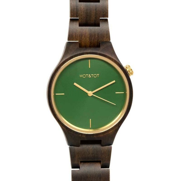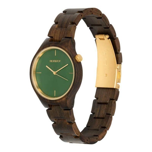 De Silva is het groene broertje van de succesvolle Bixie. Het donkerbruin gekleurde sandelhout in combinatie met de wijzerplaat van Oyster Green en de goudkleurige details zorgen voor een ingetogen en stijlvol schouwspel. Geschikt voor zowel de dames- als de herenpols en goed te combineren met een zomeroutfit of een zakelijk kostuum. Groen staat voor nieuw leven en straalt rust, hoop en vrede uit. Dit maakt de Silva een zeer exclusief houten horloge van minimalistisch Nederlands design. Gemakkelijk zelf op maat te maken met het gratis bijgeleverde horloge tooltje! Op dit houten horloge zit 1 jaar garantie.