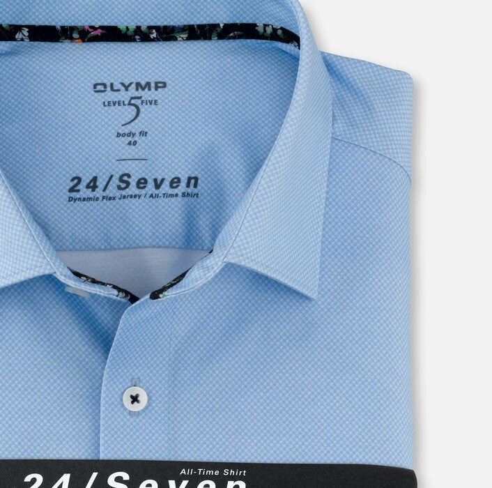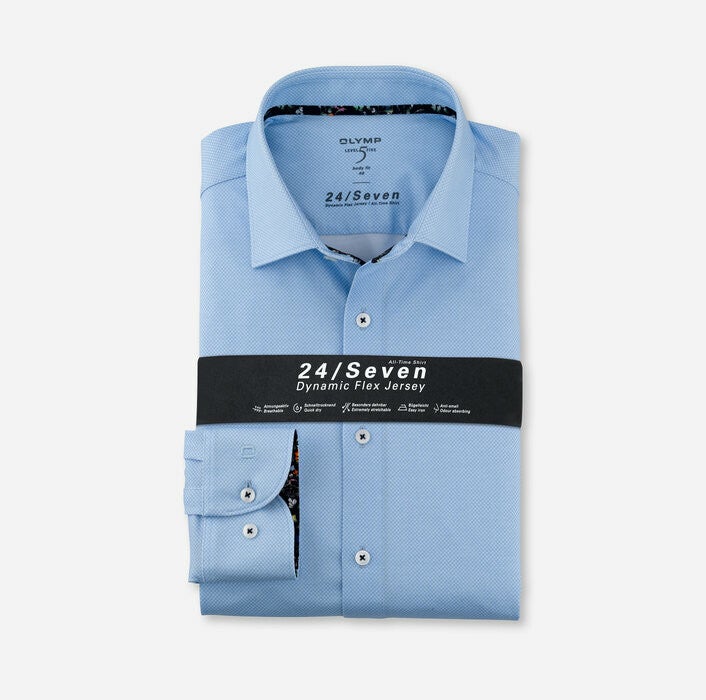 Even comfortabel als een T-shirt en even stijlvol als een overhemd. Dit 24/7 all-time overhemd neemt de zorgeloosheid van de zomer mee naar inspannende vergaderingen en zorgt onmiddellijk voor inspiratie en creatieve output. Door het modieus getailleerde model weet vooral sportminnende, clientèle de OLYMP Level Five bodyfit businessoverhemden te waarderen. Voor de aantrekkelijke vormvaste pasvorm zorgt een vezelmix van puur katoen met een klein gehalte elastisch elastolefine. Zo blijft bij een actieve levensstijl de onbeperkte bewegingsvrijheid gegarandeerd kreukvrij. De stijlvolle New York-Kentkraag met opvallend beleg maakt de stijlvolle outfit op gewaagde wijze compleet. Trouwens, ook voor wat betreft de prijs-kwaliteitsverhouding is de lijn OLYMP Level Five body fit niet te overtreffen.