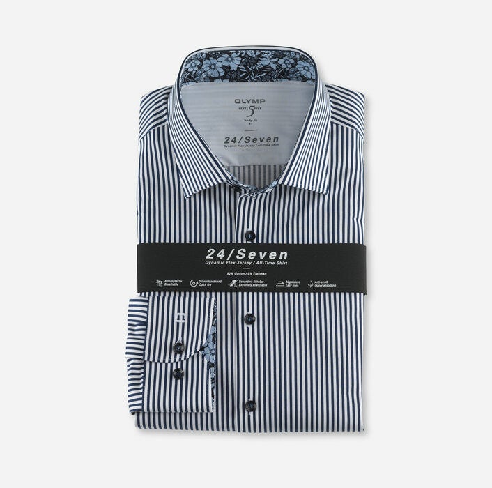 Klassieke dessins in combinatie met de supertrendy eigenschappen van het OLYMP 24/Seven-Dynamic-Flex-Jersey-All-Time-shirt uit de lijn Level Five body fit hebben enerzijds de bijzondere aantrekkingskracht van de traditionele zakelijke outfit en maken anderzijds indruk door de aantrekkelijke, aansluitende pasvorm en de ongelooflijk nonchalance van de stretchjersey, plus stijlvolle accenten en functionele highlights. Door de uitvoering met een stijlvolle New York-Kentkraag kan de casual thuiswerk-look met een colbertje en stropdas probleemloos worden veranderd in een business-look.